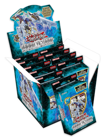 The saga of the Blue-Eyes continues in this high value box set, Shining Victories Special Edition! Packed with 3 Shining Victories booster packs, each Special Edition also contains 1 of 2variant cards, Ebon Illusion Magician or Elemental HERO Core, PLUS 1 of 2 foil preview cards of non-foil cards, Magician's Robe or Scapeghost, from the next booster set - making Shining Victories Special Edition a great value for all Duelists!
